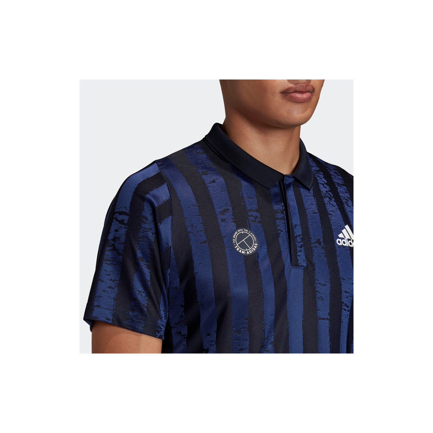 Côté design, ce polo de tennis adopte une coupe standard, en revanche, le polo comporte des rayures noires et marine, accompagné d'un patch Adidas sur l'autre côté du torse ! Cela apportera une touche de style à vos tenues !