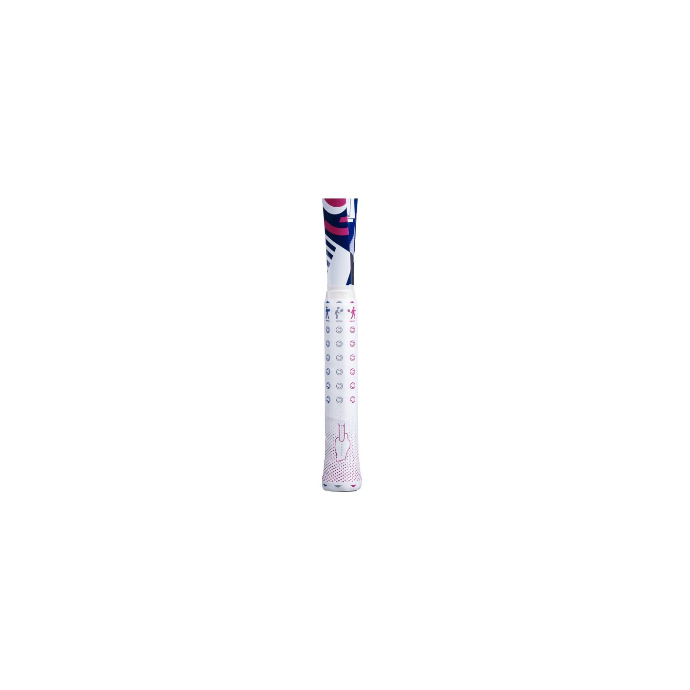 Vous comprenez maintenant pourquoi cette raquette possède un grip pédagogique et quelques aides visuelles au niveau de son cadre où Babolat a placé une petite balle et une petite raquette pour différencier les deux faces de la raquette.