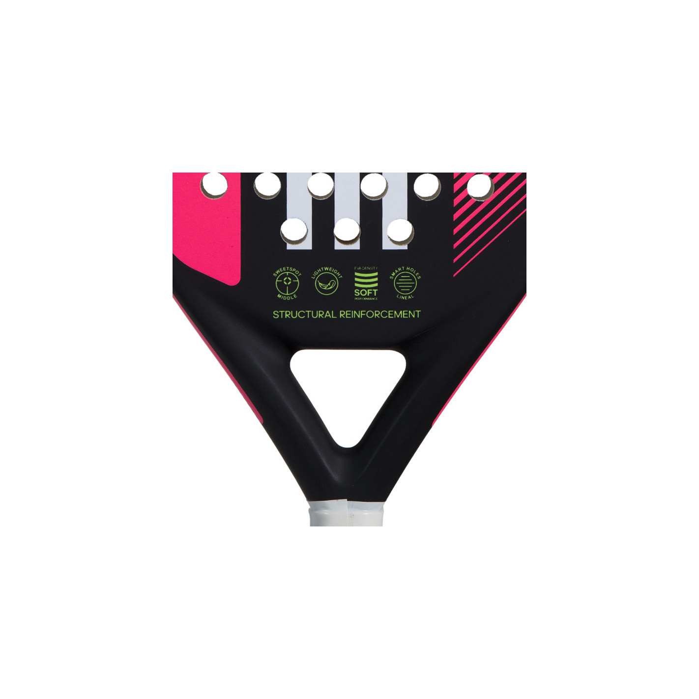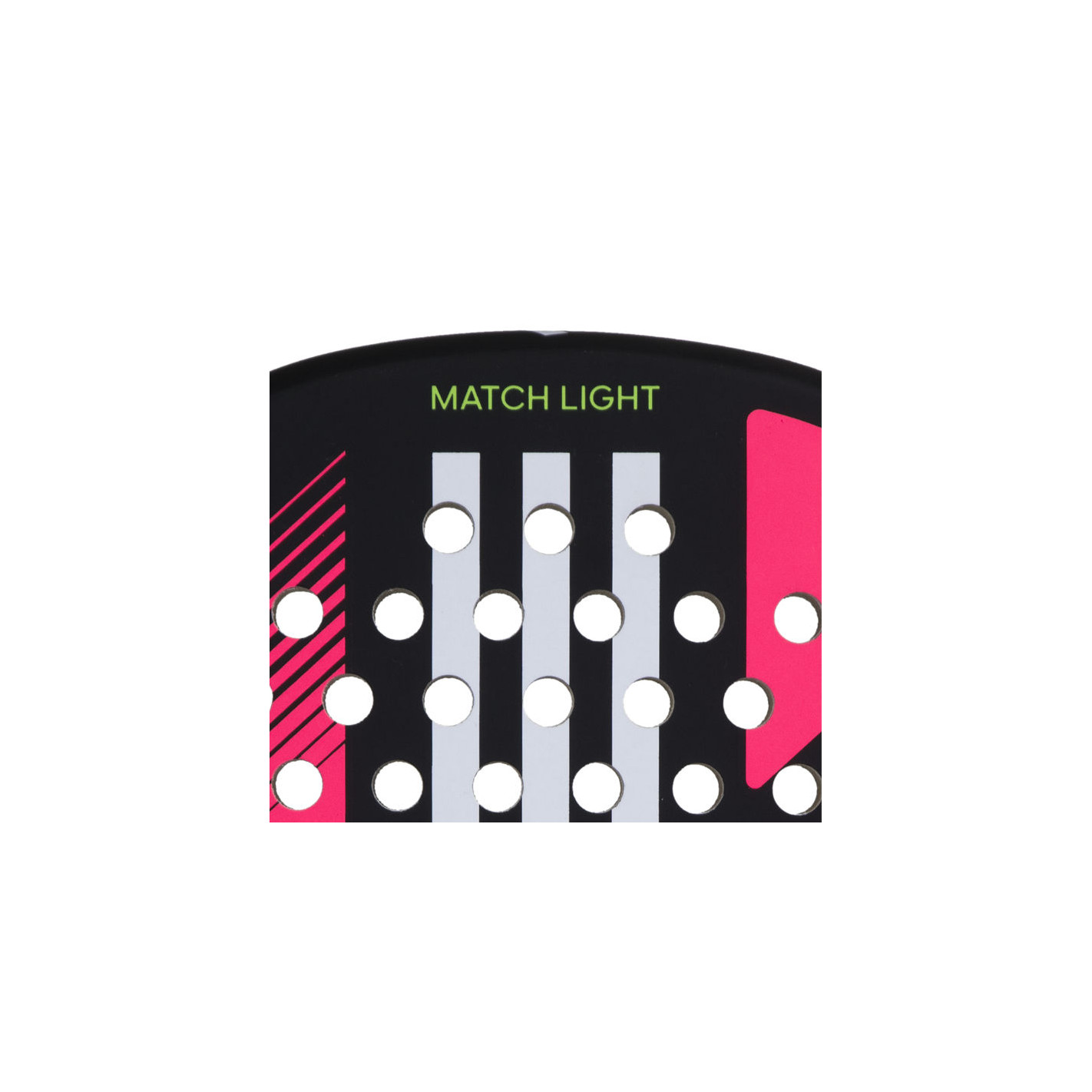 - Adidas Smart Holes Lineal : Les trous sont disposés à égale distance par groupes de 3, ce qui renforce la surface de la raquette et améliore la durabilité.