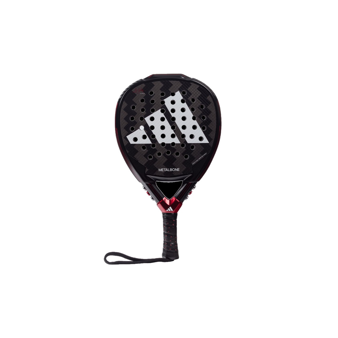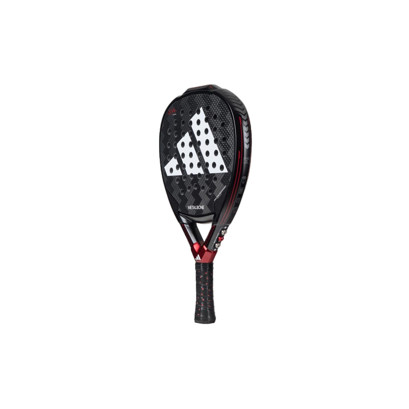 - Système d'ajustement du poids Metalbone permettant d'ajouter ou de supprimer jusqu'à 12 g, composé de 6 vis au niveau du cœur de la raquette.