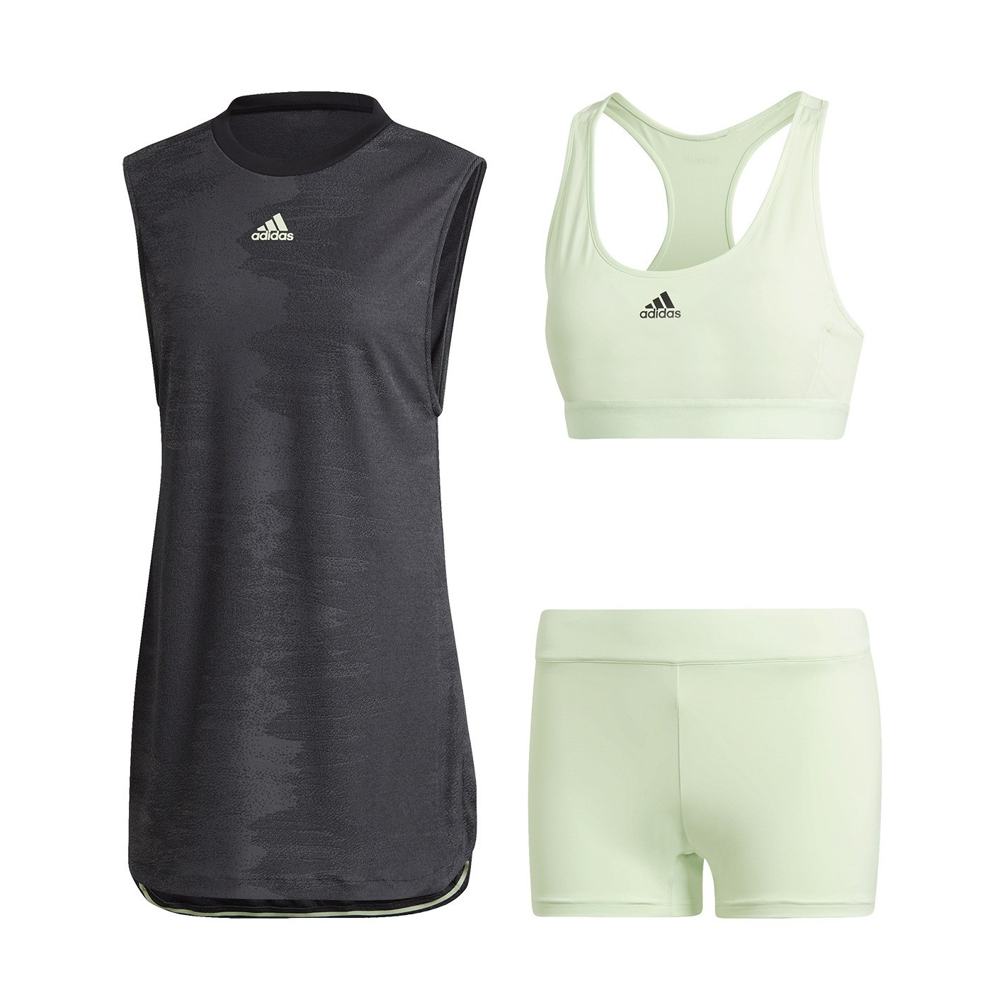 - Robe : maille double 100 % polyester recyclé. Short et brassière : jersey 86 % nylon / 14 % élasthanne.