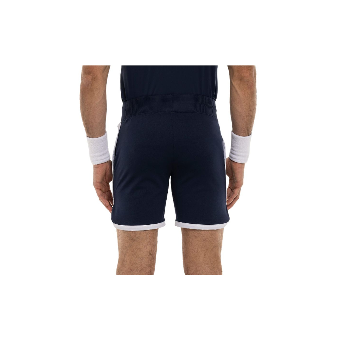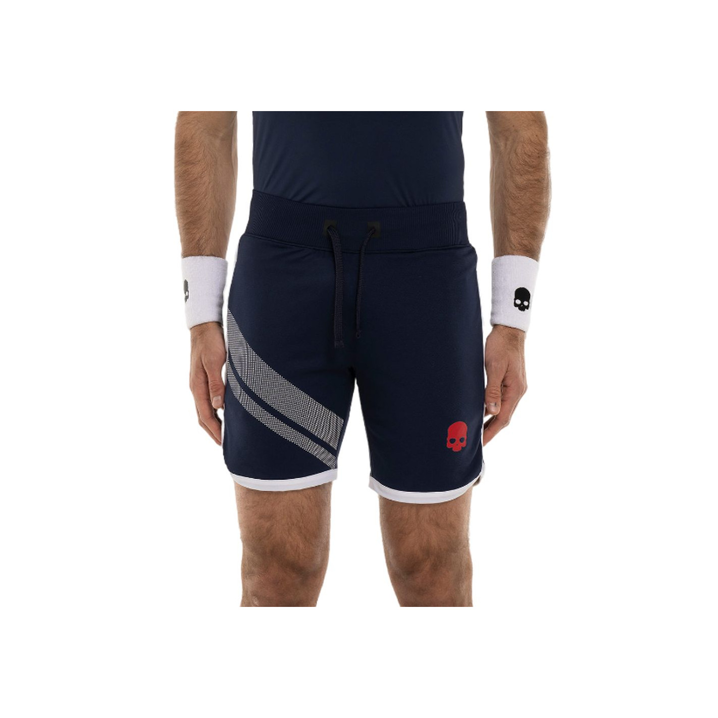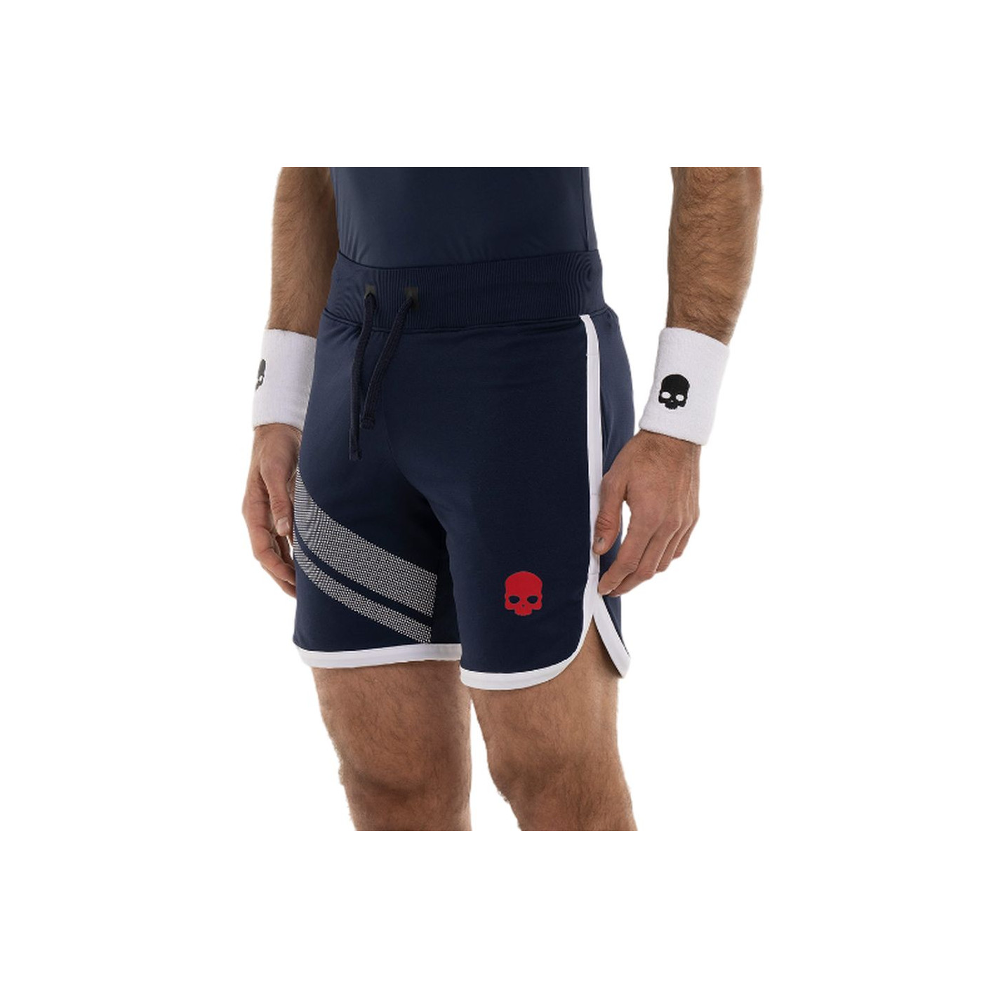 Short Hydrogen bleu marine avec double bande blanche sur la jambe droite et logo tête de mort rouge sur la jambe gauche, en polyamide piqué. Le tissu respirant garde les athlètes au sec tout en garantissant une liberté de mouvement maximale.