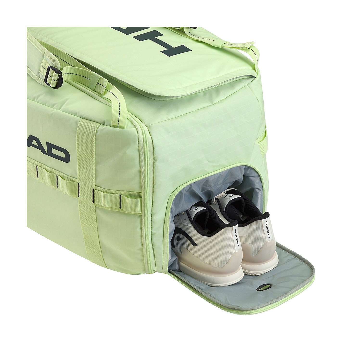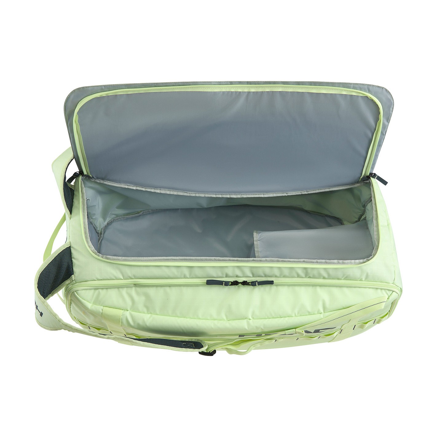 Ce sac Duffle Head est doté de deux compartiments, dont un compartiment isotherme ainsi qu'un autre compartiment qui a l'avantage de pouvoir être séparé en plusieurs espaces de rangement grâce à des parois amovibles.
