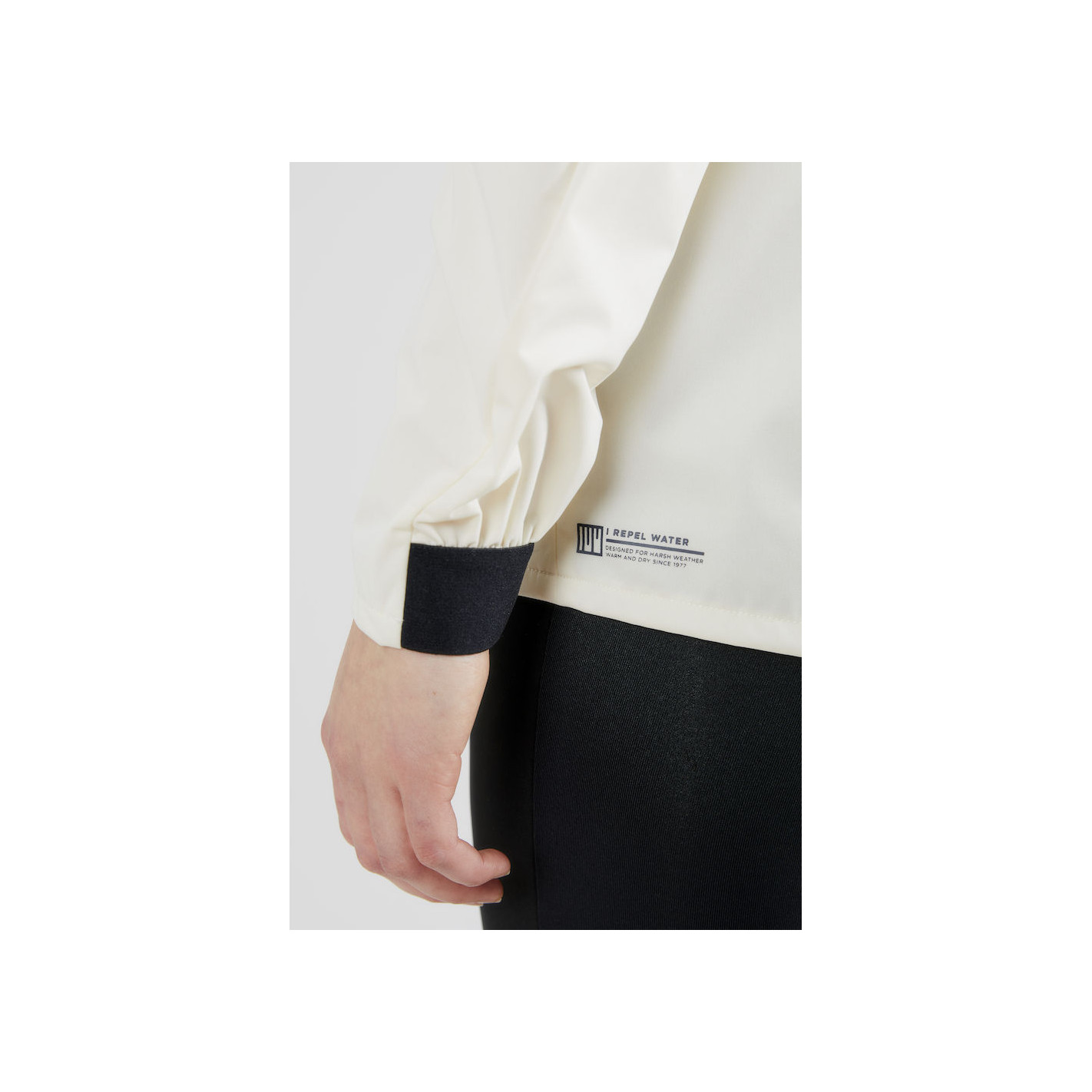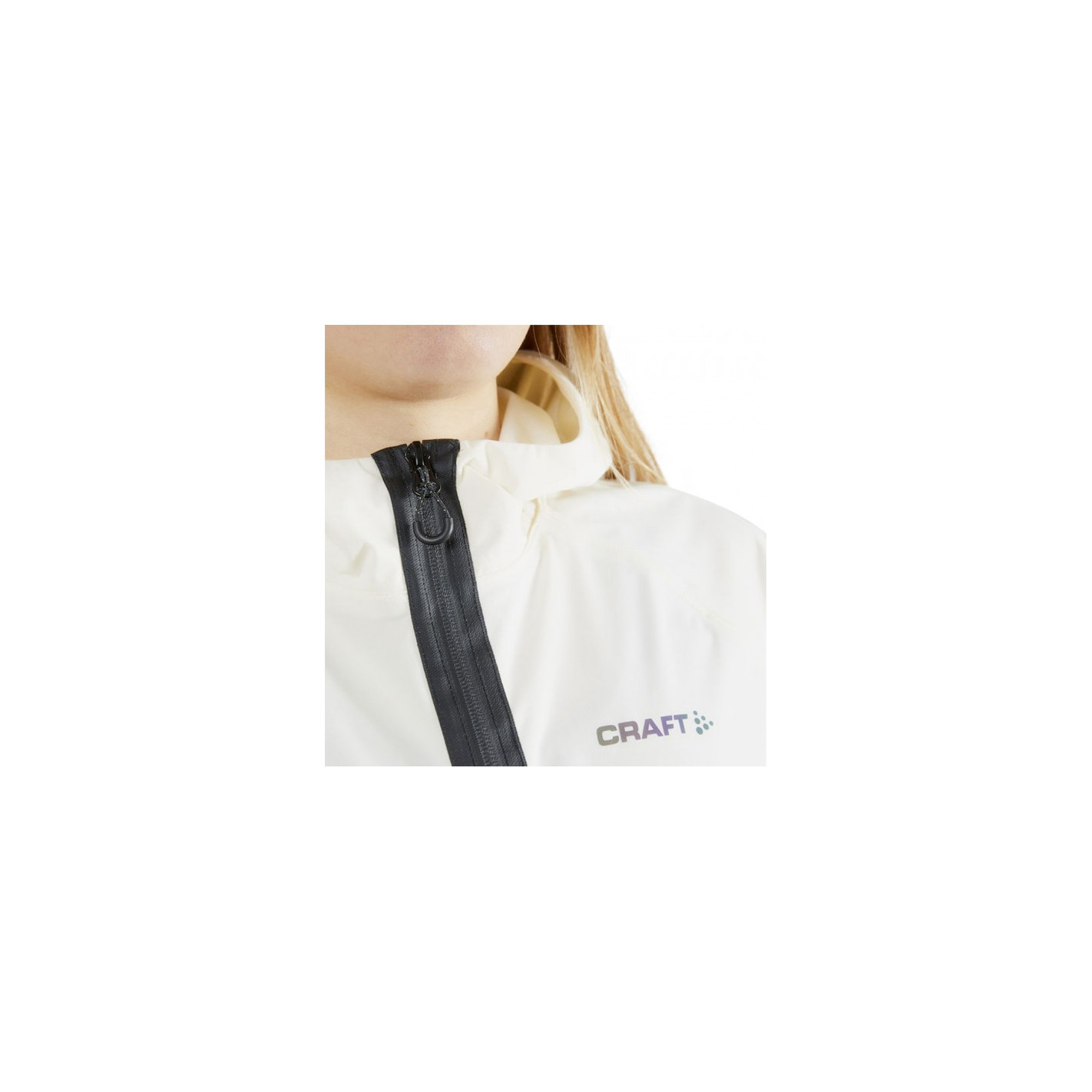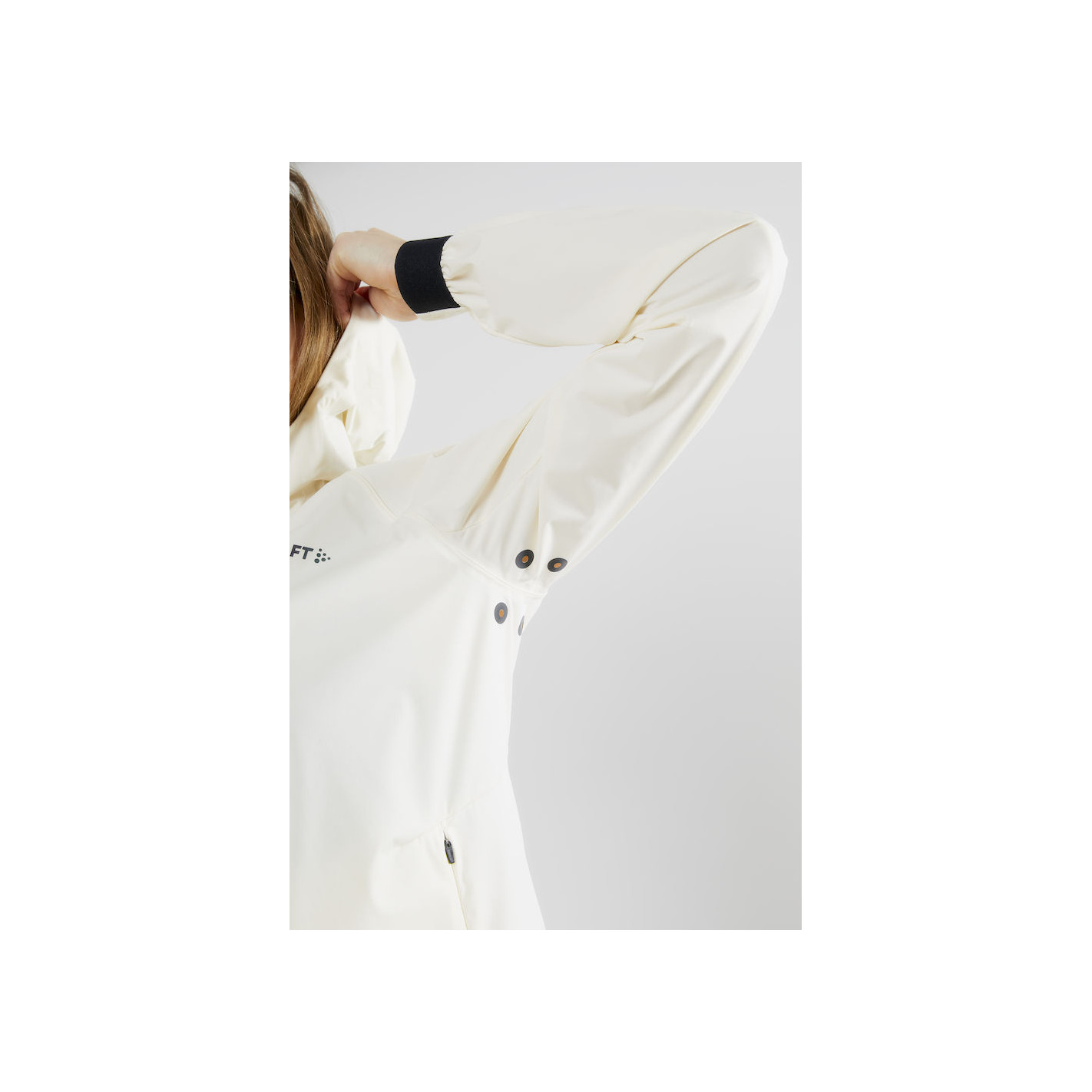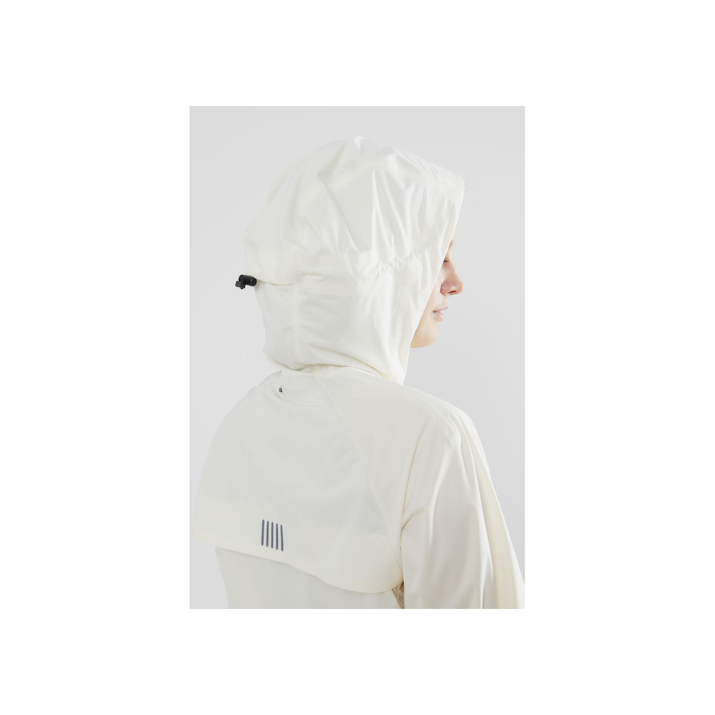Veste de running imperméable au vent et à l’eau avec coutures soudées contre les intempéries (Imperméabilité : colonne d’eau de 10 000 mm et respirabilité : 10 000 gr/m2/24h). Aération dans le dos et perforations laser sous les bras. Capuche avec attache dans le cou pour le maintien.