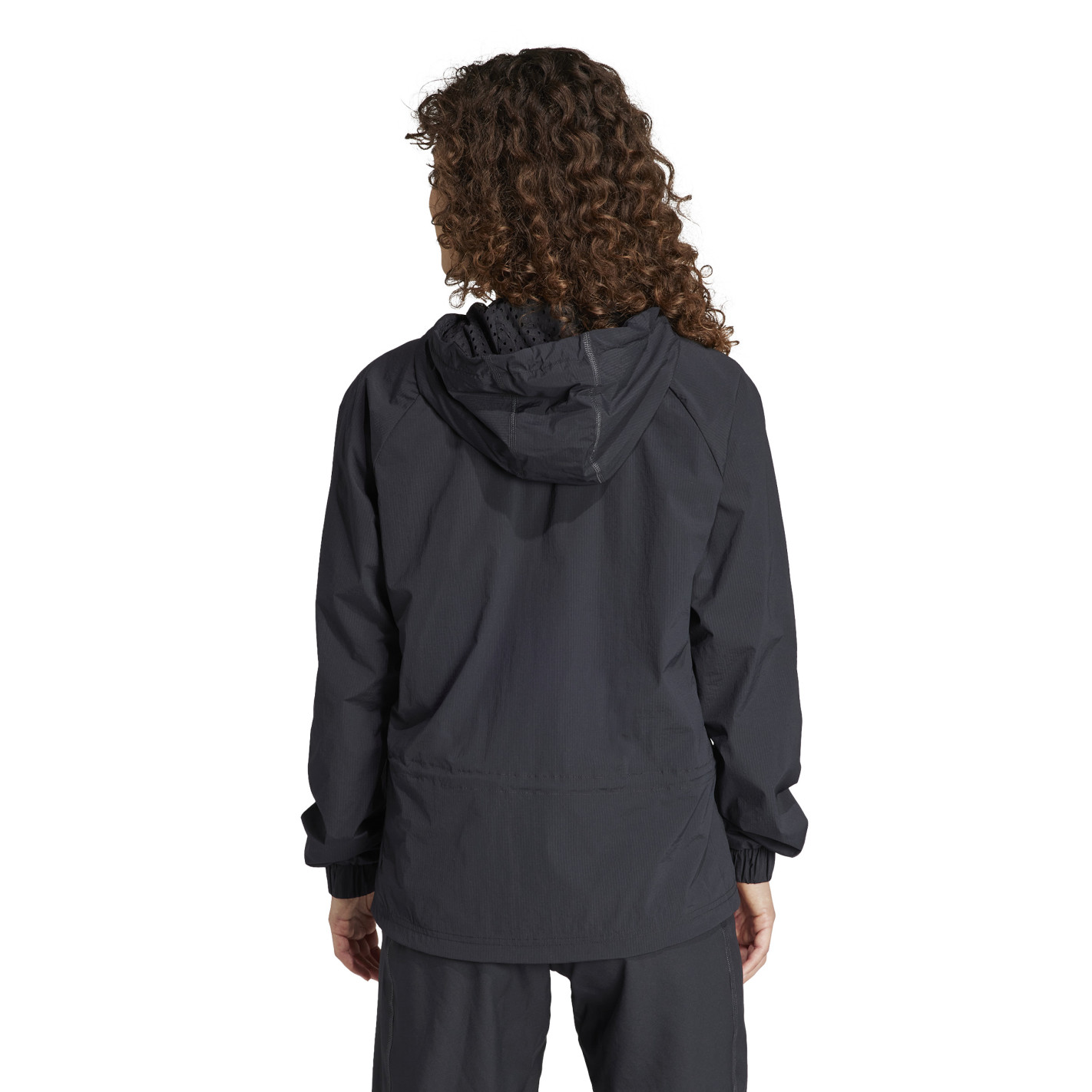 Elle possède une entrée zippée sur toute la longueur, une capuche et une taille avec des cordons de serrage élastiques et des boutons réglables, des manches raglan, une doublure entièrement en tissu maillé et un logo adidas sur la poitrine gauche.