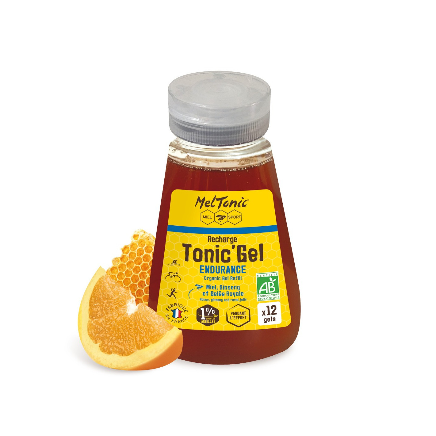 Meltonic associe les trésors de la ruche à la vivacité du ginseng sublimé par l'huile essentielle d'orange douce et de jus de citron certifié bio pour un effet « coup de fouet » lors de l'effort sportif.