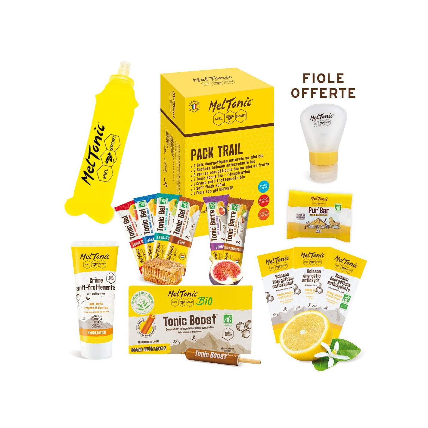 Le pack Trail Meltonic comprend des produits énergétiques naturels & bio à consommer : avant l'effort, pendant l'effort et après l'effort.